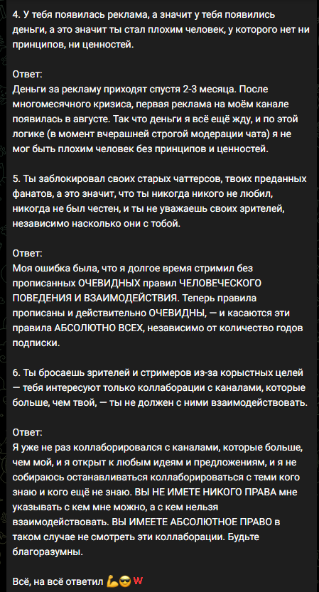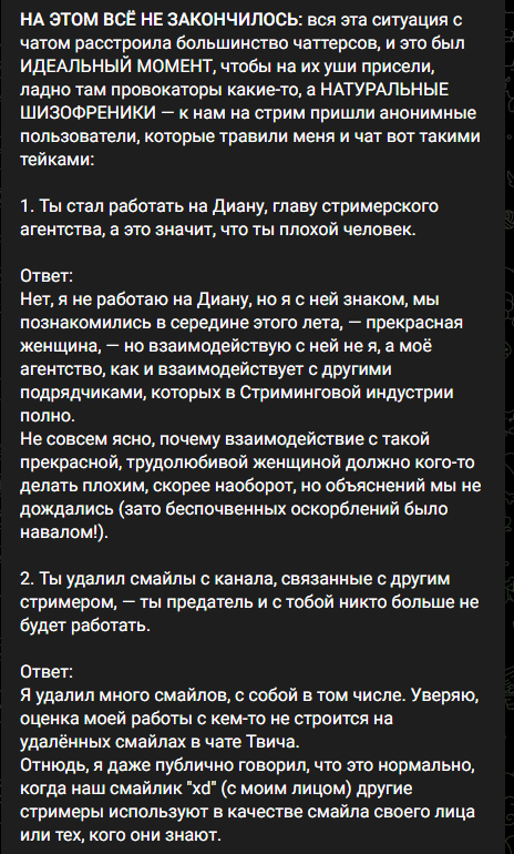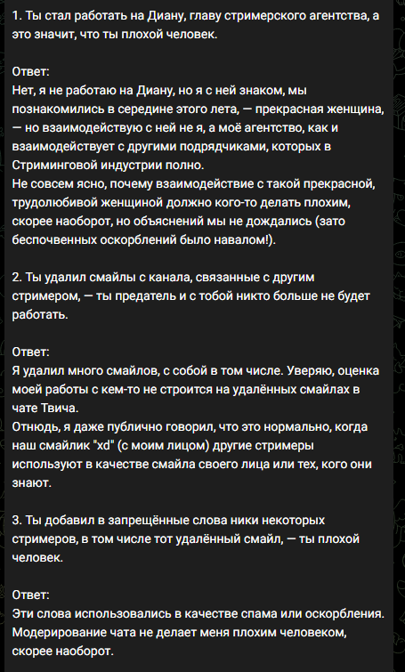 Манигга всегда порядочным был, все под линейку, смайлики, чатботы, культура чата, переодевки. На новинках, а которые он всегда первым стримил, у него было много зрителей и живой чат. С него горели жопич, ссаке и даж гитман. Он даже в те давние времена, когда отсутствие сабмода считалось моветоном - снимал его на новинках. Сейчас у него тредовские в чате всплывают иногда, он чередует игры с древним калом типа для души.