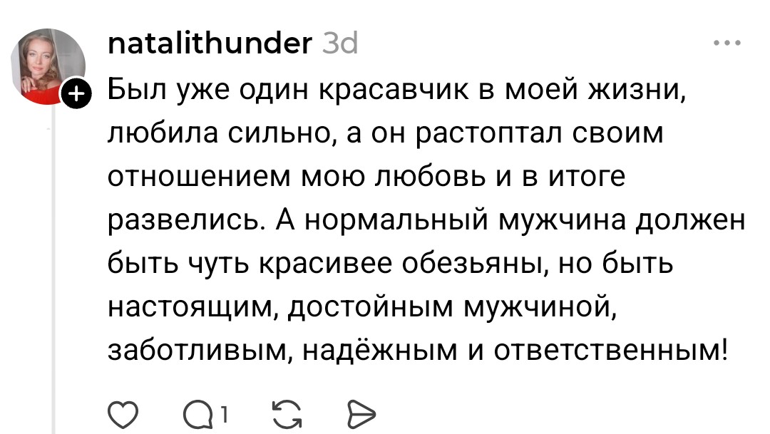 Всё хватит продолжений. Судя по многим скринам большинство отрицает важность внешки или что внешка важна до 25, а дальше женщины якобы умнеют и на другое смотрят
