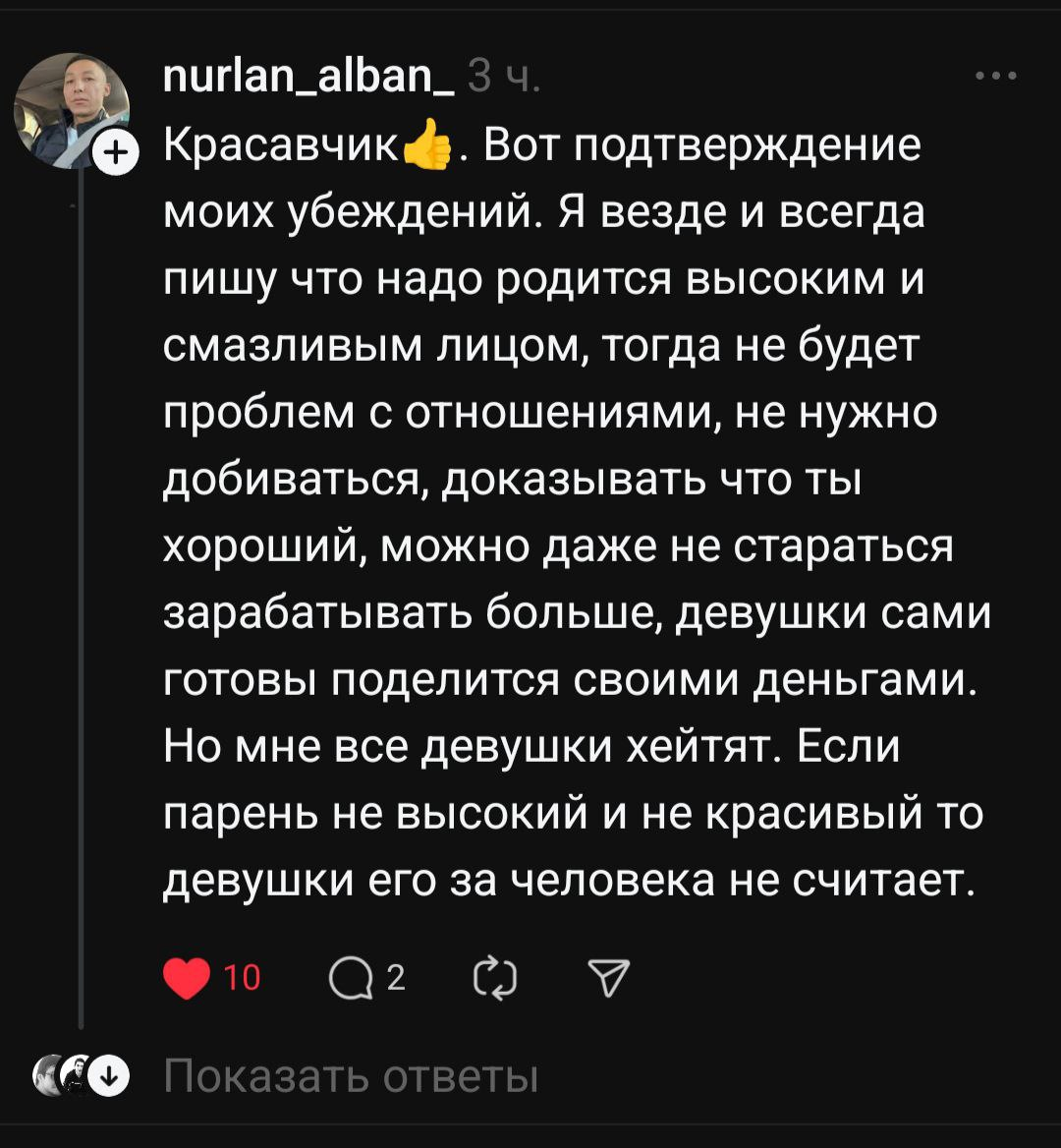 Вот типичный пример того как внешка влияет на жизненный опыт и мировоззрение. Ясен пень если ты безподбородочный лысеющий всратыш, но известный в определенных кругах , будешь бетабаксить. Можете ли вы себе представить Олега который дрожащими руками набирает ей смс: " дорогая, зарплату задерживают, прости"? 6'2 инцел на хардмаксе