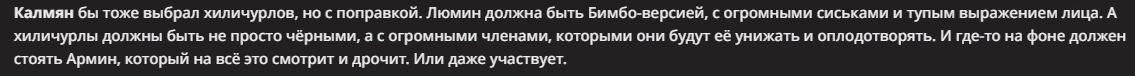 Суть: Заявить, что инцест и ебля с монстрами — это "bad ending". Нужно искать нормального парня, как Семён, и строить с ним любовь. Кто за: БЛшиз. Этот девственник-романтик не признаёт грубой ебли. Ему подавай "рут", "отношения" и ванильную хуету из его сраных новелл.