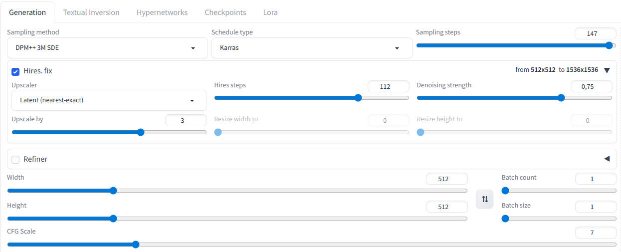 >>324444825 Ты зачем в 512х512 делаешь? Щас база как минимум 1024х1024 Семплинг степсы 20-30 ставь, в хайрезе латентом я ставлю 0, либо 15, если въеб сильный идет. Семплинг метод ставь либо Euler, либо Euler A, это золотая середина и для начала их тебе хватит, потом можешь с остальными экспеременить. Денойз выше 0.55 на латенте тебе не нужен, это считай другая картинка будет