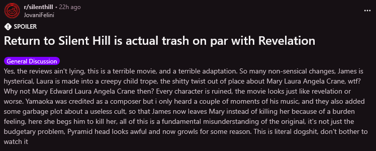 То, как выглядит этот фильм, называется стилистика. Реальная трэшовая безвкусица видна в ревелейшн - вон где все дёшево и уродливо. А француз Ганс - визионер. У первого фильма был свой стиль, у этого - свой, отдельный. Потому что режиссёр, как фанат серии, понимает, что Сайлент Хилл - персонализированный. И то как Джеймс видит город не равно тому как город видела гг из первой части. Да, графон более игровой какой-то, странный, и дело тут именно в перспективе Джеймса. Но нормисам это слишком тяжело понять, они насмотрелись видео эссе от всяких протыков на ютубе и теперь бегают со своим "правильным" мнением про то какой сх должен быть. Угу, ПЕРСОНАЛЬНЫЙ ад должен быть обязательно КАКИМ-ТО, а не разным. Заебись. Особенно смешно слышать нытьё фанатов, которые оправдывают всеми силами ориг озвучку игры, типо это так задумано, атмосфера сна, Линч, вся хуйня. Но фильм они готовы засрать, не понимая что реагируют на те же самые вещи. Только в этот раз им говорящая голова с ютуба не сказала как тут все глубоко и умно. Ну и нытьё про то что чё-то вырезали - тоже тупость. Французу видимо надо было просто лонгплей в кинотеатры пустить, а в углу свое ебало с разговорами о том как на самом деле туь все тонко. Короче похуй на быдло, выйдет в цифре - сами увидите...