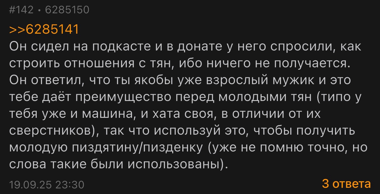 >>10339906 Мне когда было 21, то от меня 18 летняя требовала бетабакс. Чтобы работал на работе обязательно, а лучше на двух работах, тачку чтобы купил. Мы были студентами в то время. Бросила меня, променяв на мажора с тачкой и семейным бизнесом,но хуже внешкой и ростом ниже. Все знакомые удивлялись и называли стрёмным пиздец его, что она не стеснялась его в соцсетях выставлять,а меня нет, потому что по ее меркам и ее родоков я был нищеброд, запрещали общаться, но мы виделись без палева у меня на хате. И это мы были меньше полутора лет, а запросы начались уже в первые месяцы, ещё на гормоналке как то держалось это, но потом сила бетабакса победила. Мажорику дала условие полгода без секса, он согласился и со старта начал на тачке возить и бетабаксить. Предлагала быть любовником, но я типо любил ее и не согласился (сейчас согласился бы, изи секс пока другой бетабаксит, но я тогда не знал блекпила). Хз считать себя ли в данном случае Чедом если такое предлагала, но она всё же изменила перед этим и променяла на бетабакс, не хотела ждать долго и месяц до этого я даже на работу пошёл чтобы совмещать с учебой этого было мало. Поэтому везёт тем кто без денег тянок в эти натягивает и от них не требуют