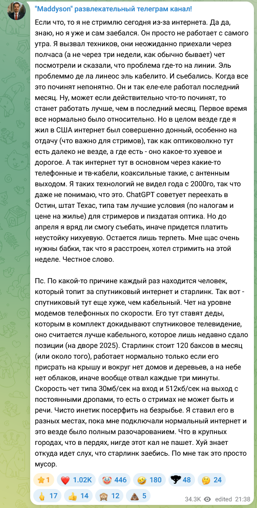 >>25256297 Что-то дед пиздит слегка. Просто ему эту тарелку покупать не хочется. Да нормальный у него интернет, я ни разу проблем не замечал за все последние стримы. Все ровно шло. Записи тоже нормально работают. Пиздаболы с хуевым лучшим интернетом в мире говорят про дропы. А жопич Илюша верит и оправдывается.
