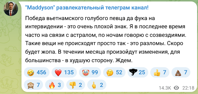 Победа вьетнамского голубого певца да фука на интервидении - это очень плохой знак. Я в последнее время часто на связи с астралом, по ночам говорю с созвездиями. Такие вещи не происходят просто так - это разломы. Скоро будет жопа. В течении месяца произойдут изменения, для большинства - в худшую сторону. Ждем.