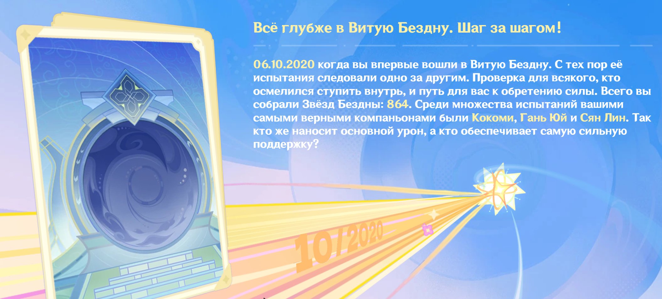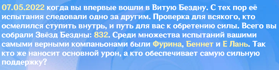 Статистика врет, Казуху выкрутил в конце Иназумы, а в середине Фонтейна он уже протух. Половину Сумеру не играл, так что выходит не так уж и много Казуха был в безднах. Потом, раньше-то две бездны в месяц было, а сейчас одна, вот и выходит, что за полгода старой бездны набегала как за год новой. Короче, статистика подкрученная