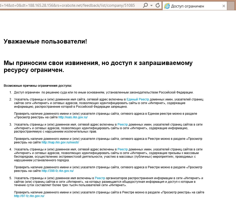 >...а сегодня выяснилось, что под блокировку попал портал «О Работе» (orabote net), где каждый может оставить отзыв о своем текущем или прошлом работодателе.