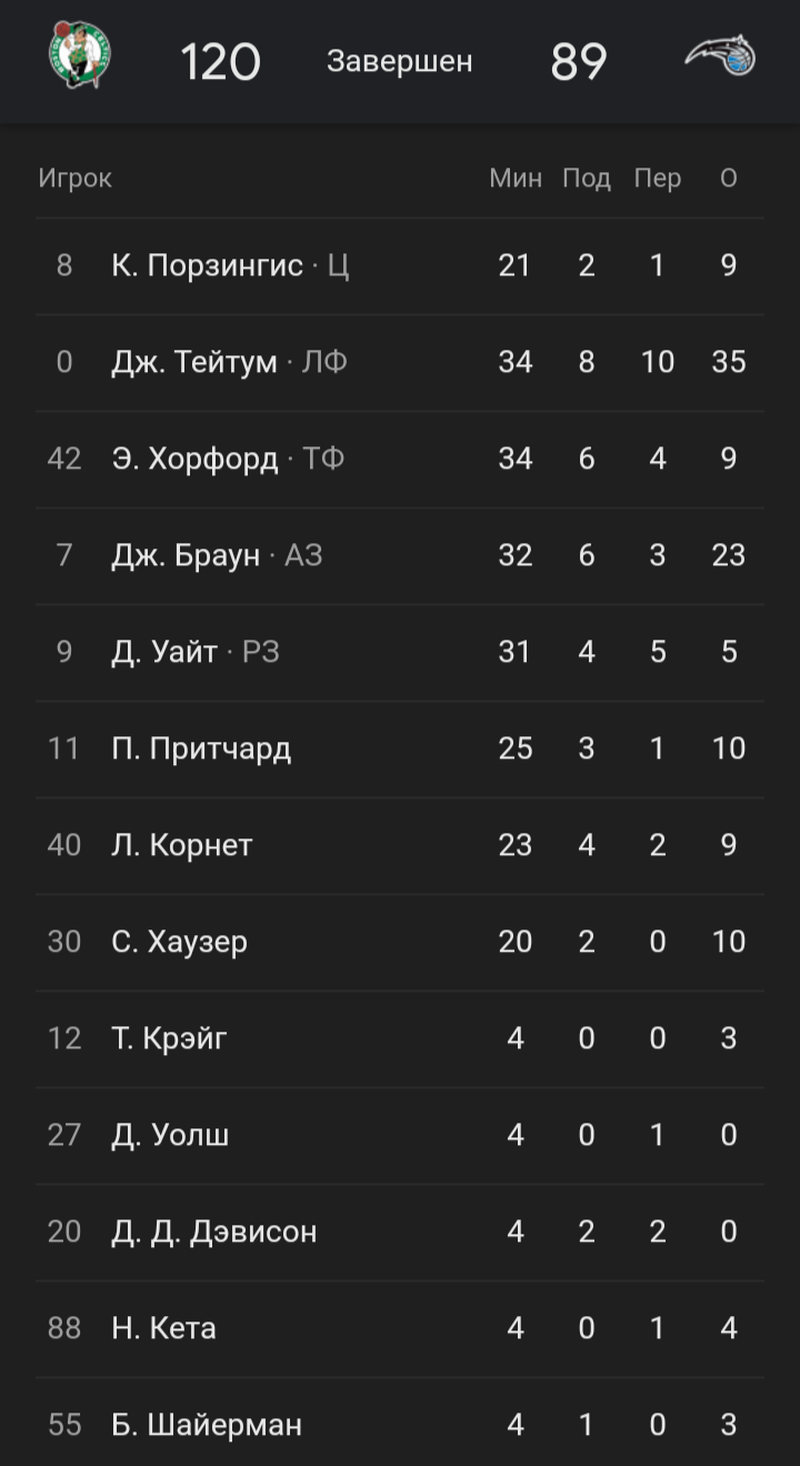 Сегодня Бостон был типичен. Первая половина - обкатка минимальных настроек, но стоило чуть-чуть включиться во второй - случился разгром. И звезды, и скамейка сыграли как надо. Топил за Орландо в детстве из-за Ховарда, но нынешние костоломы вызывают только отвращение. На одних Вагнере и Банкеро далеко не уедешь, поэтому приходилось ломать Тейтума, Порзи. Мерзкая тима, пусть едут на рыбалку. Бостон ждёт Никс/Пистонс