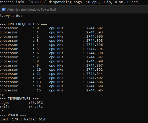 >stress -c 16 -t 600 до 68 доползло какие при этом частоты по ядрам через 5 минут теста?