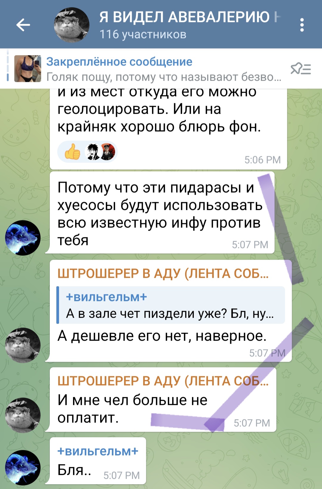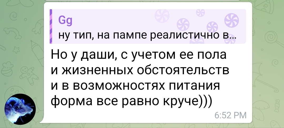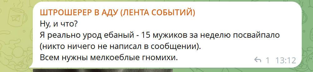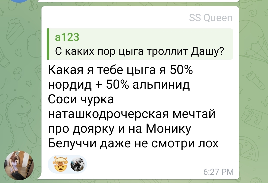 >>25337227 Она прекрасно знает что скрины будут, пасется в треде постоянно, оцените скорость реакции, что называется. Если бы она тут не была, то хрен бы и запостила скрины из треда в тг. Забавная ситуация получается, мы с ней общаемся теперь скринами с разных платформ для общения.