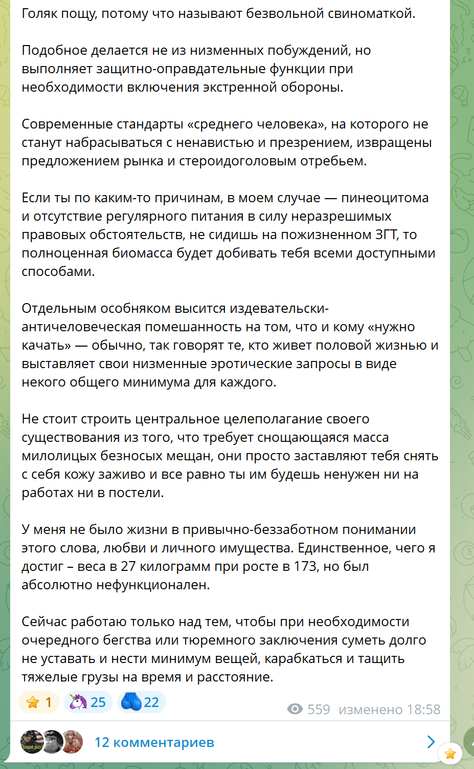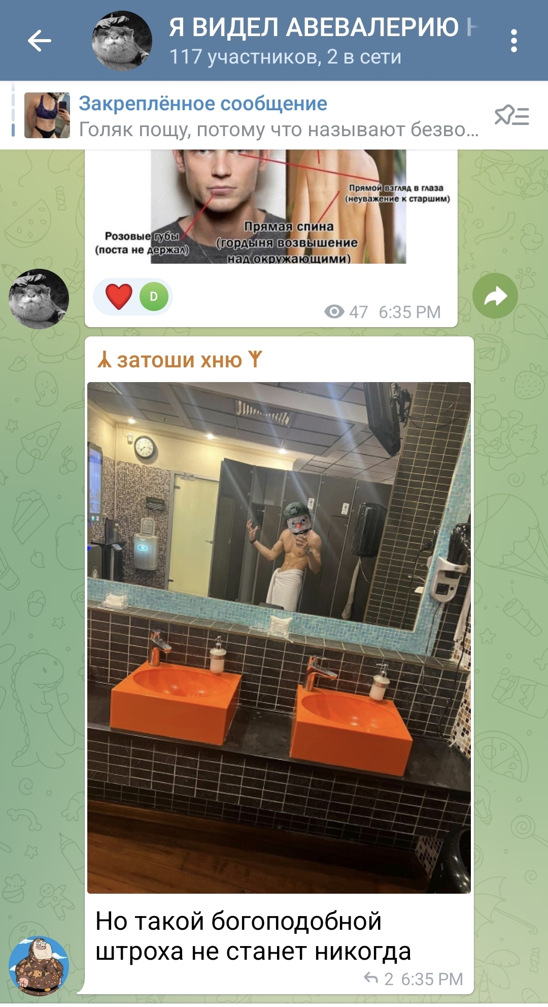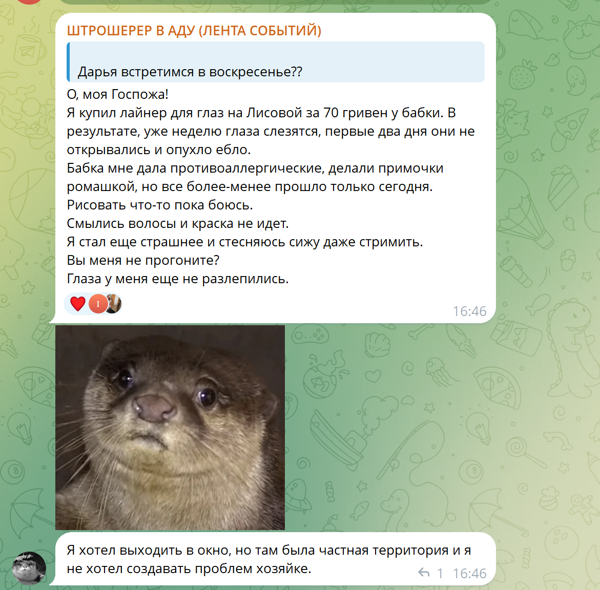 >>25337227 Она прекрасно знает что скрины будут, пасется в треде постоянно, оцените скорость реакции, что называется. Если бы она тут не была, то хрен бы и запостила скрины из треда в тг. Забавная ситуация получается, мы с ней общаемся теперь скринами с разных платформ для общения.