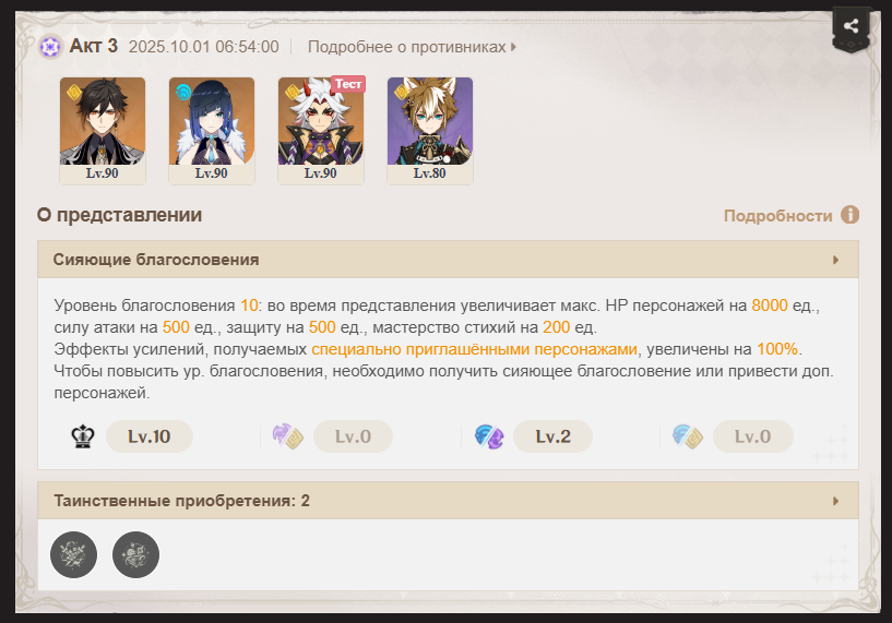 Ну что ж, новый театр фигня как обычно. Хотя я имею одних из лучших и вообще сильнейших персов под ресет. Но кокблоки и ограничения как обычно убивают весь фан, интерес и баланс. Прошел, но кайфа ноль. Еще и оказывается Сук опять удалился из друзей, ветренный челик какой-то. Хорошо в друзьях есть верные ребята и с помощью дружеской с3 Райден я смог с кайфом пронести пару комнат в пачке с Лаумой, Синцю и Байжу. Театральная Коровка кстати очень приятная и классная оказалась Вкинул все добытые сегодня крутки в баннера. Оружка теперь 40+, перс 75. Так что походу теперь точно копим, если уж с такой подачки он не пришел
