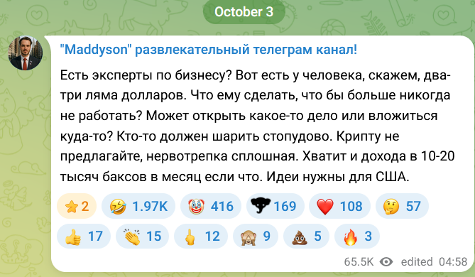 совсем охуел уже сам даже думать не хочет надо чтобы батраки придумали как миллионеру больше никогда не работать за него пошел нахуй уебок