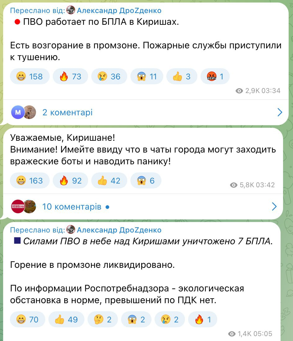 Губернатор Ленинградской области подтвердил атаку и пожар в промзоне, а также сообщил, что огонь уже потушен, не называя атакованное предприятие.