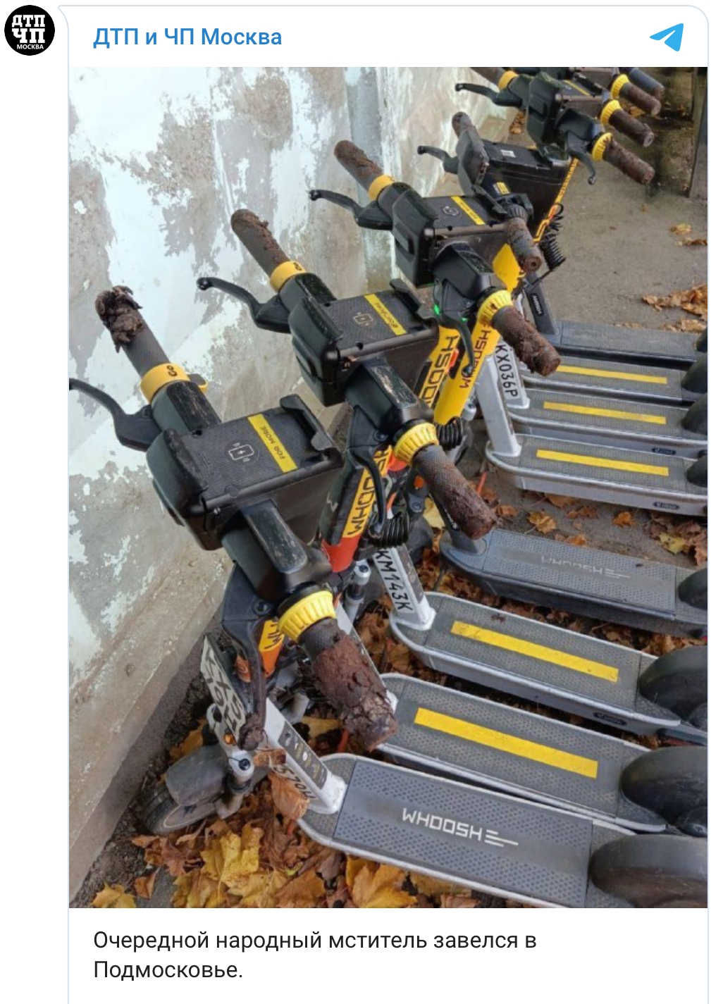 На опубликованных в сети кадрах видно, что ручки у восьми электросамокатов обмазаны фекалиями.