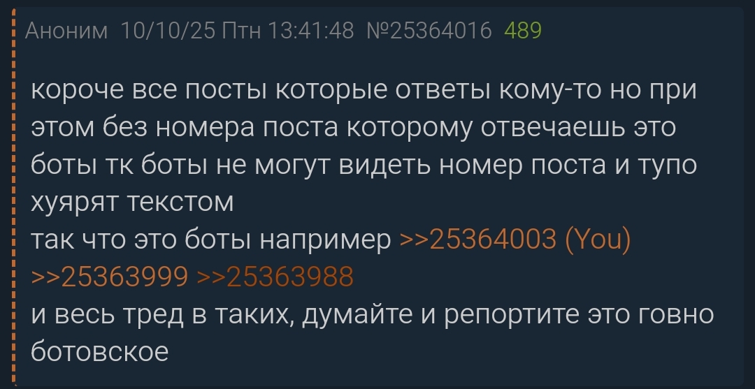 короче все посты которые ответы кому-то но при этом без номера поста которому отвечаешь это боты тк боты не могут видеть номер поста и тупо хуярят текстом