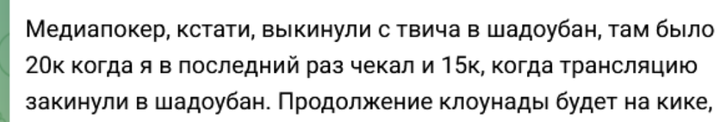 я про твич и говорю, не было там 15к после бана, они даже специально на канал кори мс переехали и там было 11к всего. Дауны готовы любой хуйне от чмодья верить