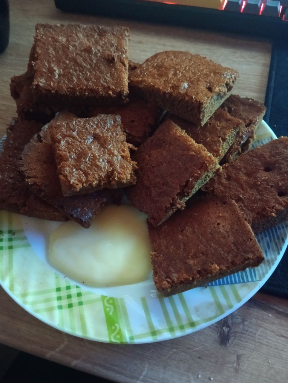 Облизывает тарелку со сгущенкой и лопает коржики