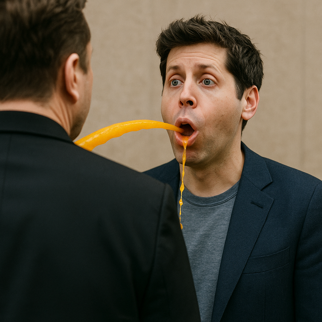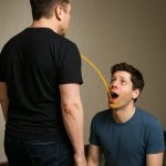 Сэму альтману в рот апельсиновый сок . Но бутылку мы не видим, маск стоит к нам спиной, мы видим лишь струю сока. В целом это больше шутка уровня спуф кино. Тут главное не изображать бутылку, в цеолом изображение нейтральное, а апельсиновыфй сок довольн вкусный. Илон Маск стоит перед сэмом альтманом, как бы возвышаясь, а сэм альтман перед ни на коленях. надо понимать что это сложная метафара на противборство двух ии-идеалогий, Альтман не повержен, и смотрит в будущее с оптимизмом, подкрепляя силы апельсиновым соком