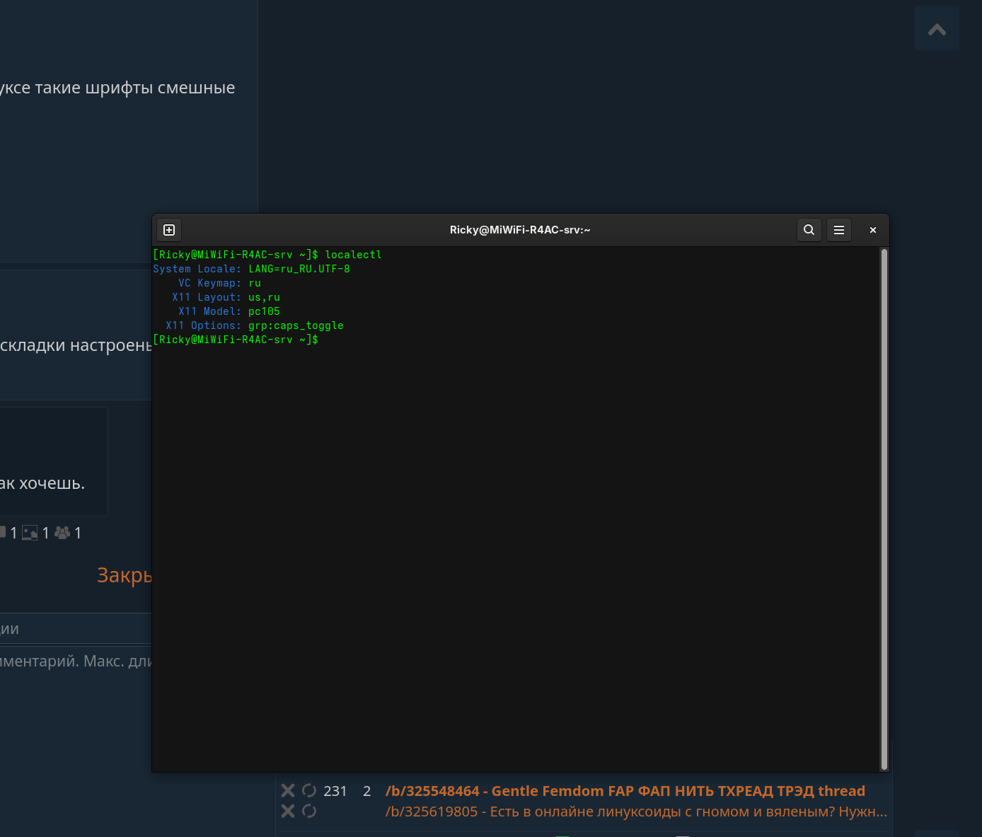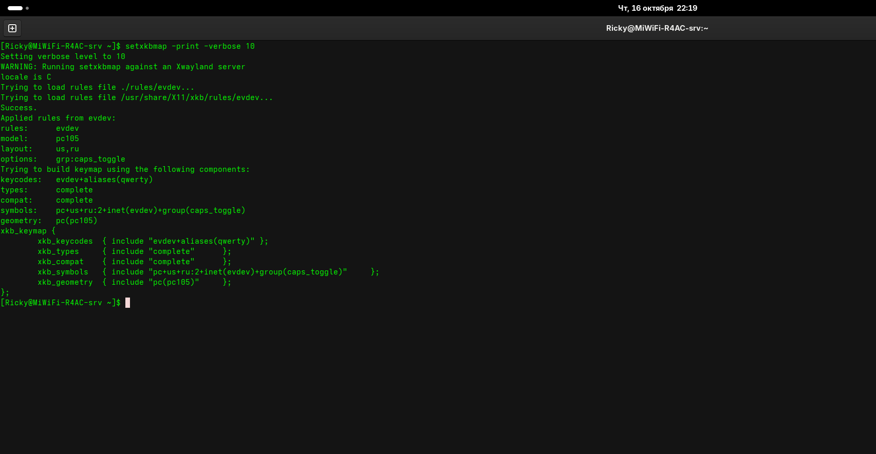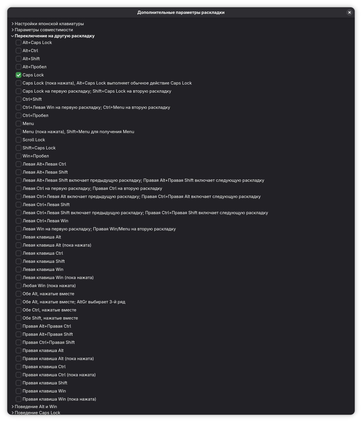 Когда-то настроил я через gnome-tweaks себе капс в качестве переключения языка. И был у меня wayland, и боги gnu-linux были довольны. Но всё изменилось, когда я решил поставить иксы. Поставил я их нахуй, а потом удалил аккуратно, так как не подошли они мне. Так вот, с тех пор как я удалил иксы капс перестал переключать язык, но зато win+capslock теперь выполняет с какого-то хуя эту функцию. И я бы мог смириться с этим, если бы не пустая раскладка, которую он хуячит после попытки переключиться с русского на англицкий. Просто иконка языка пропадает, язык остается русским итак, пока я снова не переключу язык. Я проверял локальстатус, проверял, какие раскладки есть, проверял kbd со всех сторон, обращался к форумам, к нейронке, но эта хуйня не меняется никак. Причем, при запуске gdm на уровне ввода пароля от учетки капс выполняет свою функцию, хоть и продолжает переключаться по принципу en>ru>ничто>en.