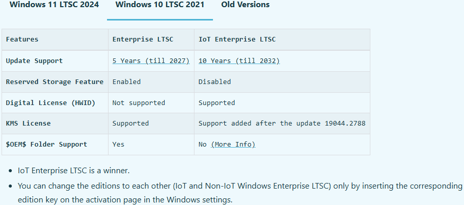 При выборе версии между последней 22H2 и LTSC 2021 (21H2) нужно учитывать, что некоторое современное ПО (например MS Studio, часть от Adobe и Apple, Dolby, DirectX 12.2 Ultimate) не поддерживает 21H2 или LTSC. Также будущие версии .NET и Office могут не поддерживать 21H2, которой неизменно является LTSC 2021.
