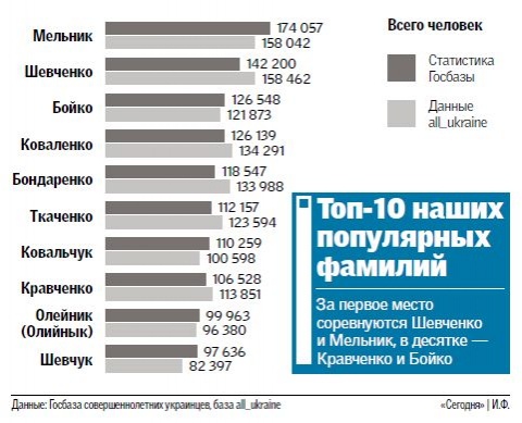 Итак, существует 10 самых распространенных украинских фамилий и все их носители представлены в ВК. Мы просто посмотрим сколько людей с такими фамилиями живут в Украине и сколько в России. Но я сделаю следующим образом. Соотнесу эти 10 фамилий со всей Украиной, ну как будто что других нет и просто наложу в процентном отношении на численность их уже в России.