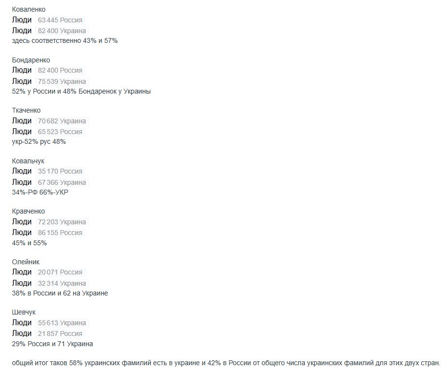 Общий итог таков - 58% украинских фамилий есть в Украине и 42% в России от общего числа украинских фамилий для этих двух стран.