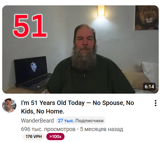 Он в видосе говорит о том что счастлив, и еще говорит о том что нельзя бездумно разбрасываться временем своей жизни. Говорит что идите и делайте то что вам хочется. Жалуется что проработал 25 лет. Да да, а откуда баблишко на путешествия? Накопил кучу бабла и сидит ноет, а я тут в Украине сижу и слушаю этот бред от человека который нормальную жизнь прожил, и не рождался в снг параше