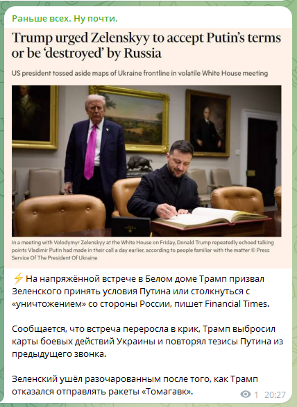 Сообщается, что встреча переросла в крик, Трамп выбросил карты боевых действий Украины и повторял тезисы Путина из предыдущего звонка.