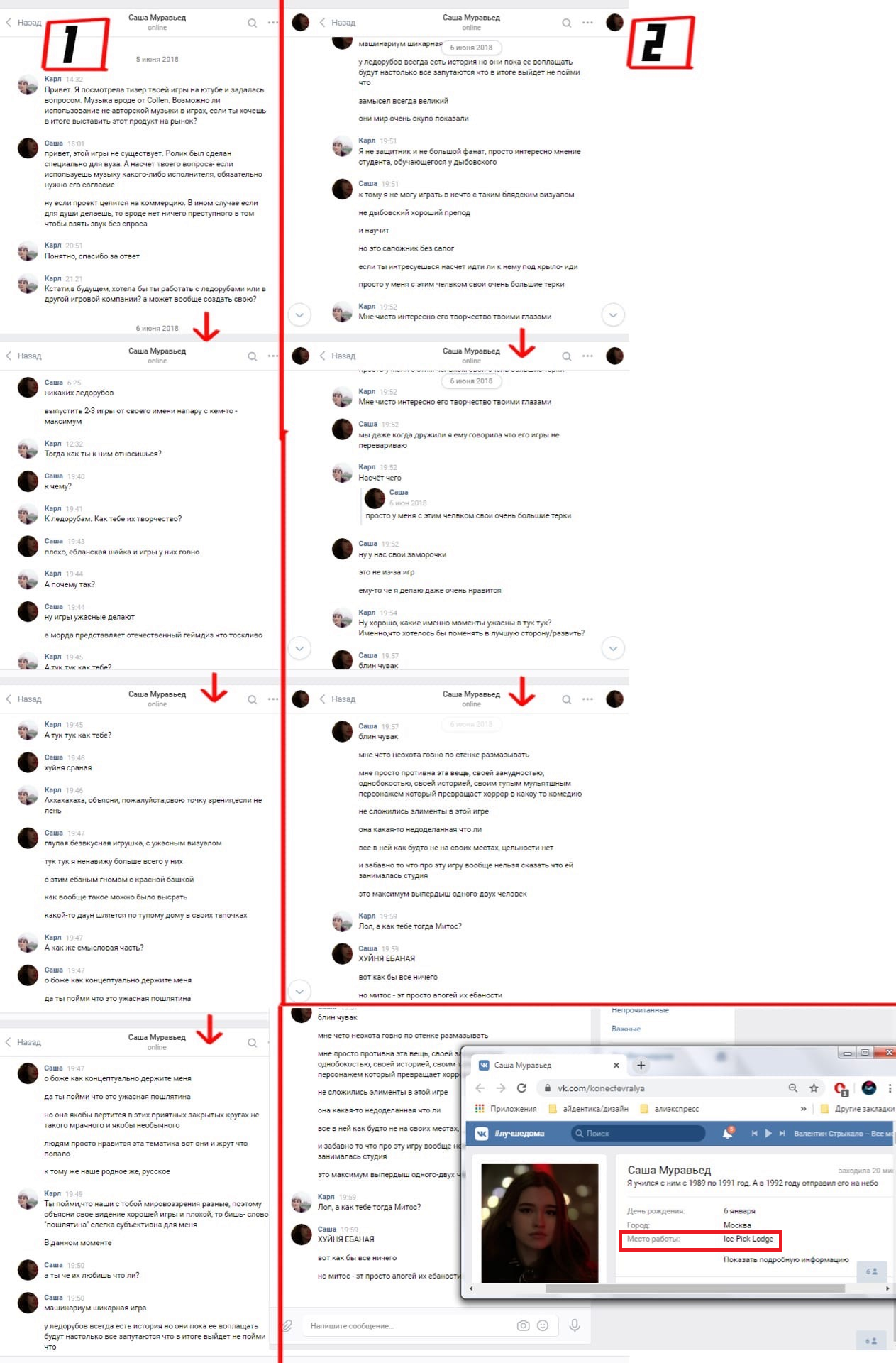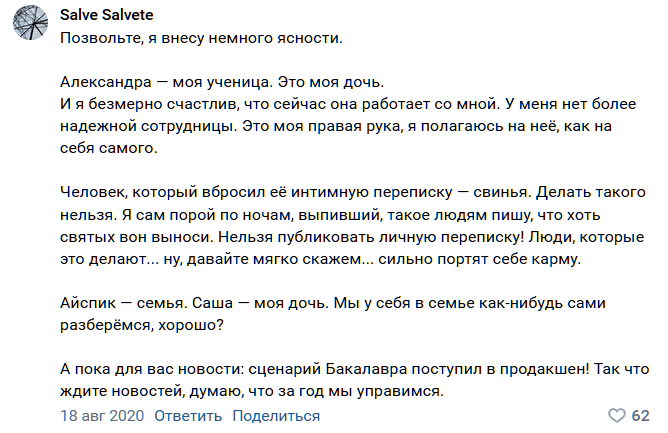 Ну и в итоге в какой-то момент всплывает старая переписка многолетней давности, где Немосода называет IcePick бездарями и убожествами, а особенно хуесосит старую художницу - Митоса. Это раздувается до скандала, аноны кекают. И в комментарии прибегает сам Дыбовский - вот его защита Немосоды на скрине. Она, понимаете, "дочка", часть семьи. Знаем мы этих "дочек".