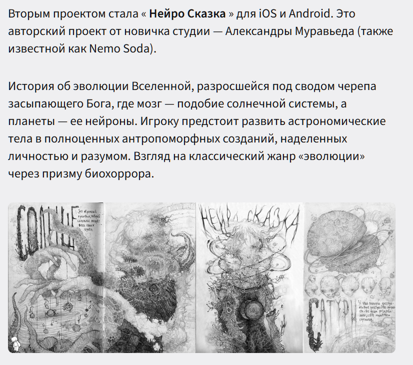Потом он её перетащил в Ice Pick lodge, где она тусила и бухала, была частью богемной тусовки. То-сё пятое-десятое, буквально через полгодика анонсируется игра от IcePick lodge - Нейросказка, во главе разработки - 20-летняя пиздючка Немосода - нихуя себе получается, какой быстрый карьерный рост. При этом даже по собственным словам кодить она не умеет, только рисовать вот таких кляксоподобных страшилищ, а на зачетах вместо прототипов приносила просто презентации в паверпойнте и "договаривалась" с Дыбовским. Понимаете, да?