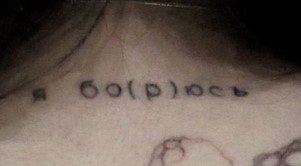 Этот партак не просто говорит, а он орёт ебейше Я ЕБАНУТАЯ.