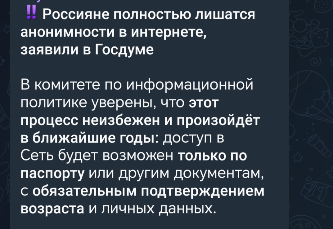 Правительство Великобритани... кхе-кхе ... Россияне полностью лишатся анонимности в интернете в ближайшие годы. Комитет по информационной политике считает этот процесс неизбежным в ближайшие годы: доступ в интернет будет осуществляться только по паспорту или другим документам с обязательным подтверждением возраста и личных данных.