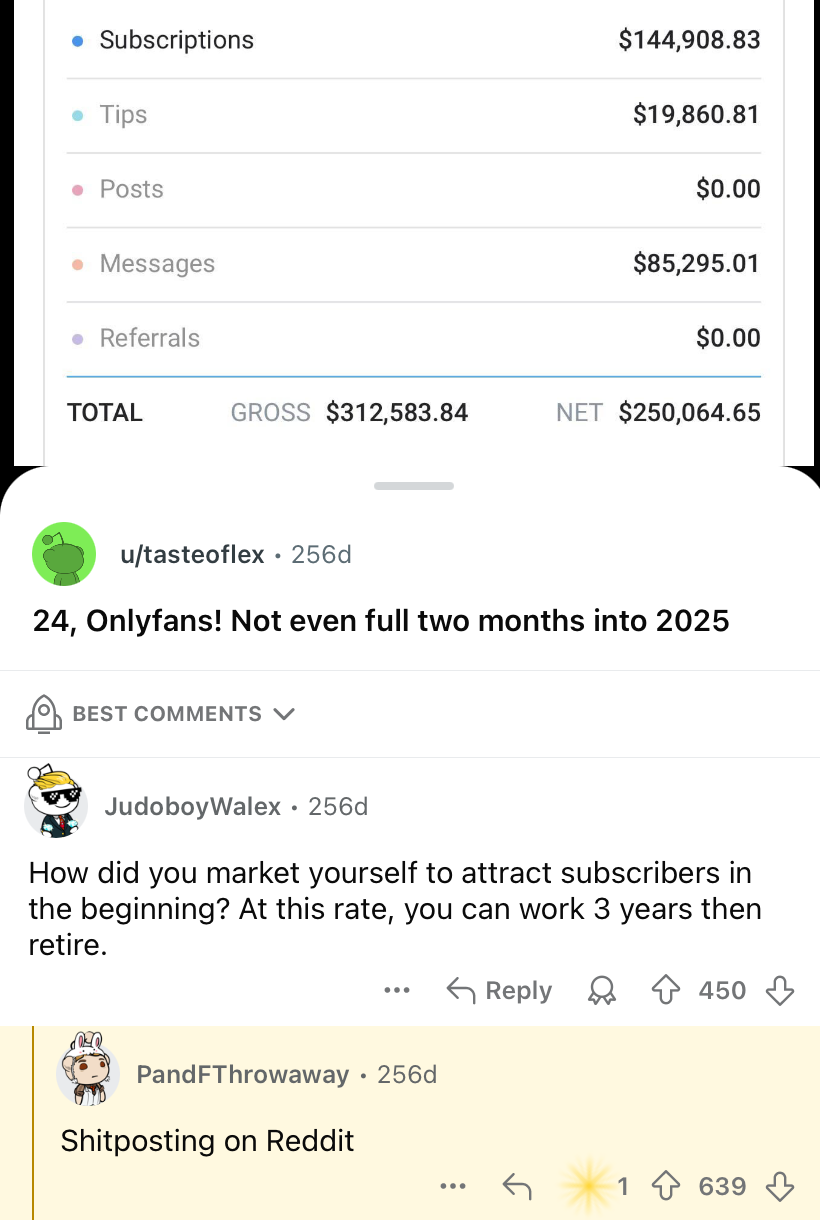 Рядом 18-летняя пизда записывает ролик для онлифанса, где у нее миллион подписчиков и каждый месяц она лутает больше, чем ты за год в своем бизнесе.