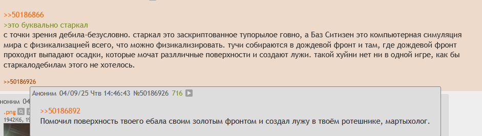 >>50186866 >это буквально старкал с точки зрения дебила-безусловно. старкал это заскриптованное тупорылое говно, а Баз Ситизен это компьютерная симуляция мира с физикализацией всего, что можно физикализировать. тучи собираются в дождевой фронт и там, где дождевой фронт проходит выпадают осадки, которые мочат разлличные поверхности и создают лужи. такой хуйни нет ни в одной игре, как бы старкалодебилам этого не хотелось.