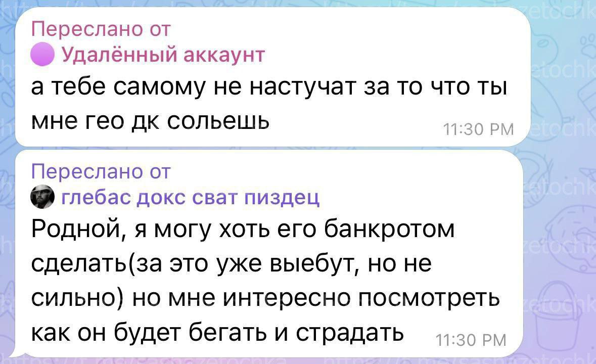 >>6320723 — "Видел историю с твоим бывшим менеджером?" нет, не видел, с каким? "Шубин Вадим" а, этот который тачку у Тушенцова украл, а че там, он накосячил опять? "Паспорт слил, номер слил" Тушенцов паспорта сливает..? "И адрес ещё!" адрес родителей? Че за хуйня? "Там адрес, юз, номер его и его матери" Пиздец.. Честно, не знаю, должна ли мать отвечать за поступки её сына.. Ну у Шубина крутая мать, она директор в одной школе. Я с ней пересекался разок, у меня есть история как я накосячил! Короче, я снимал ролик про Фэйса, и там такой сюжет, что продюсер Фэйса пробил ему концерт в школе, и мы пришли снимать сценку в эту школу, а это была школа где директор - мать Шубина! Я по факту сам накосячил, но мне так влетело пиздец. Родители увидели, что в школе там матюки снимали и в некой ярости были.. Но в итоге все хорошо обошлось, ролик я не удалил принципиально. Ну короче я хуй знает, это странно, матерей сливать.. "Ты извинился хоть?" конечно! Я написал Вадиму, сказал: «Устройте родительское собрание, я извинюсь перед всеми» потому что понимал, что ей может очень влететь за это, но в итоге она ничего не стала делать, все обошлось. Короче, это мразотский поступок - сливать родителей.. Я, как человек, который сам пережил слив родителей не могу сказать что это хуйня, как-то поддержать этот поступок, понимаете? "Мама Вадима вроде даже не знает, что её сын натворил" да конечно, Вадиму же больше 30 лет уже блять! Конечно мама за него не отвечает, о чем речь? - Даня