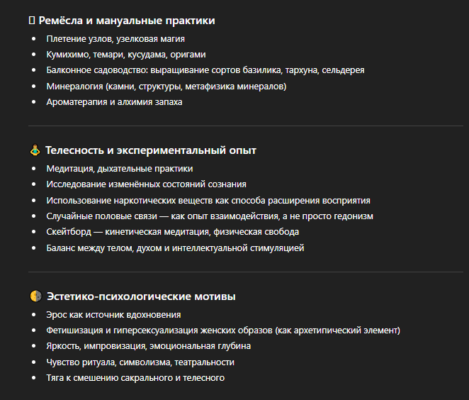 Блендер, фрутилуп, анимация, чутка кодинг, турники, ардуино кринж проекты, парфюм, гитарка. Кста, считаюсь маргиналом на работе и в своих пердях. Хотя и не творил никакого треша. Поэтому хуйня про саморазвитие, про то что якобы хобби что то там тебе даст - поебота для дебилов полная. Лучше прокачивайся по работе, и получай норм деняк