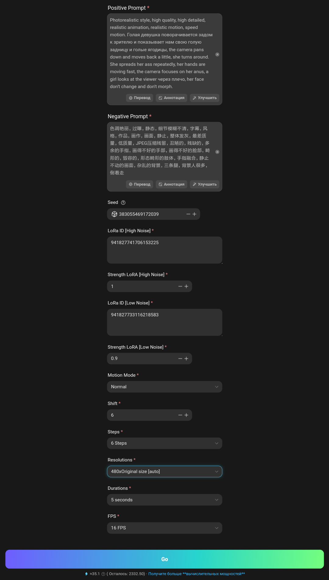 >>25816860 Заходишь сюда https://tensor.art/template/run/938001115897669229?source_id=kTi3oljqkUi7pfMua37w8RYh логинишься через гмаил или через любую другую почту регаешь акк, тебе дают 50 кредитов, можешь там ещё аватарку поставить, логин поменять можешь потом, дальше возвращаешь на эту ссылку https://tensor.art/template/run/938001115897669229?source_id=kTi3oljqkUi7pfMua37w8RYh делаешь настройки как на скрине с этими данными - promtPhotorealistic style, high quality, high detailed, realistic animation, realistic motion, speed motion. Голая девушка поворачивается задом к зрителю и показывает нам свою голую задницу и голые ягодицы, the camera pans down and moves back a little, she turns around. She spreads her ass repeatedly, her hands are moving fast, the camera focuses on her anus, a girl looks at the viewer через плечо, her face don't change and don't morph. LoRa ID [high noise] - 941827741706153225, LoRa ID [low noise] - 941827733116218583 ну и вставляешь фотку желательно чтобы не было видно нижней части тела и чтобы над головой было место, потому что камера вниз опустится и лица может быть уже не видно, ну или любую другую фотку подбирай, но нужно будет промт подправить ту часть что на русском, а то что на английском лучше не трогать, ну всё вроде написал, а ещё там балов мало дают, особо не разгонишься, но можно открыть две вкладки с этим инструментом, заполнить данные и выбрать настройки получше(720п, 8steos, 5сек, 24фпс) и загрузить две разные фотки, генерация двух видео будет стоить дороже 50, но из-за того что они будут генерироваться одновременно, снимут только 50, там счёт не может уйти в минус. Там ещё много возможностей, но долго и много объяснять, лучше сюда https://2ch.su/nf/res/52742.html заглени, там много инфы и ссылок на всякое, ну и видосов всяких с Ариной и неграми не мало.