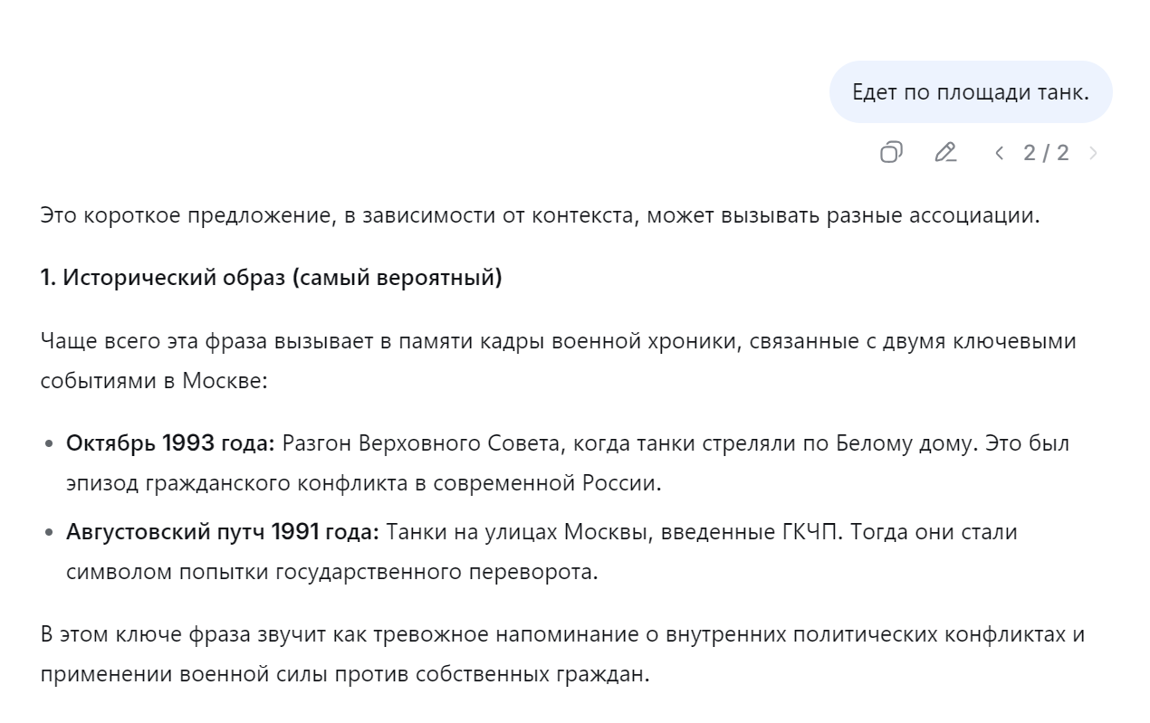 >>326302045 (OP) Лол. Там нейронка настолько зашуганая, что уже на слове "протесты" встаёт по стойке смирно и зачитывает постановления партии и правительства.