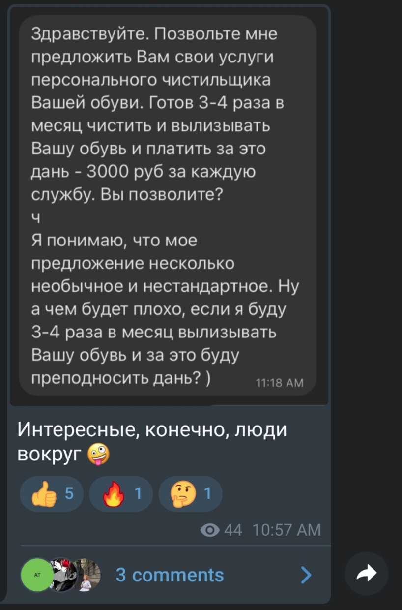 Звучит как фантазии куколда одебилевшего, либо это переписка со шлюхой со специализацией на унижения, другого объяснения я не вижу. Даже самый опустившийся кун (без перверсий) не будет так куколдить, не верю