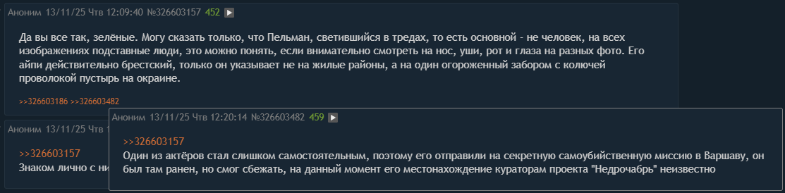 >>326632530 > Т.е. это всё происходило в конфоблядстве, или был тред? Таблица постоянно была доступна в гугл-доке весь год. я периодически туда поглядывал чисто из интереса. Когда появились первые предтерды, кто-то создал то ли 25-го октября то ли чуть раньше, решил заглянуть в нее, на 25-е число там даже конь не валялся, а вот потом где-то 28-го я увидел первые изменения. > Думаю ты понимаешь, что это тоже притянуто за уши. Лучше пусть он ответит Не спорю, голословно, хотелось бы его послушать, но примерно зная его натуру он скажет, что конечно же вынашивал. Но пусть ответит, если сможет. > Ну да, это понятно тебе, понятно мне, а вот понимает ли это Служанкич - вопрос Это самый главный вопро, но мы тоже с тобой понимаем что да как.