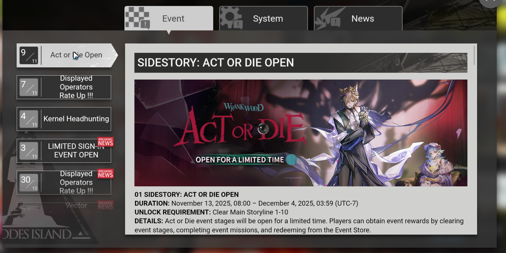 Vector Breakthrough #1 Inorganic Matters начался 30 октября и продлится до 20 ноября, участвуйте в сложных боях с элитным оперативником Механистом и получайте разные награды! Также в ивенте присутствуют свои бафы, для получения которых надо проходить отдельные карты и оставлять там операторов, с которыми и прошли, в гарнизонах. Операторы из гарнизонов недоступны в линейке боёв, только если их заменить другими.