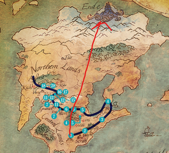 >>7957340 Ну типа они шли по дорогам, а дороги проложены между населёнными пунктами. Плюс ты линию прямо через горы провёл, хрен там пройдёшь. Плюс пройти на север было невозможно без мага первого ранга, поэтому пришлось идти в город, где проводился экзамен. К тому же, в первых сериях они ещё никуда не шли, а просто бесцельно скитались по континенту. Но вообще да, всё очень сильно затянуто, и маршрут как будто бы удлинён искусственно.