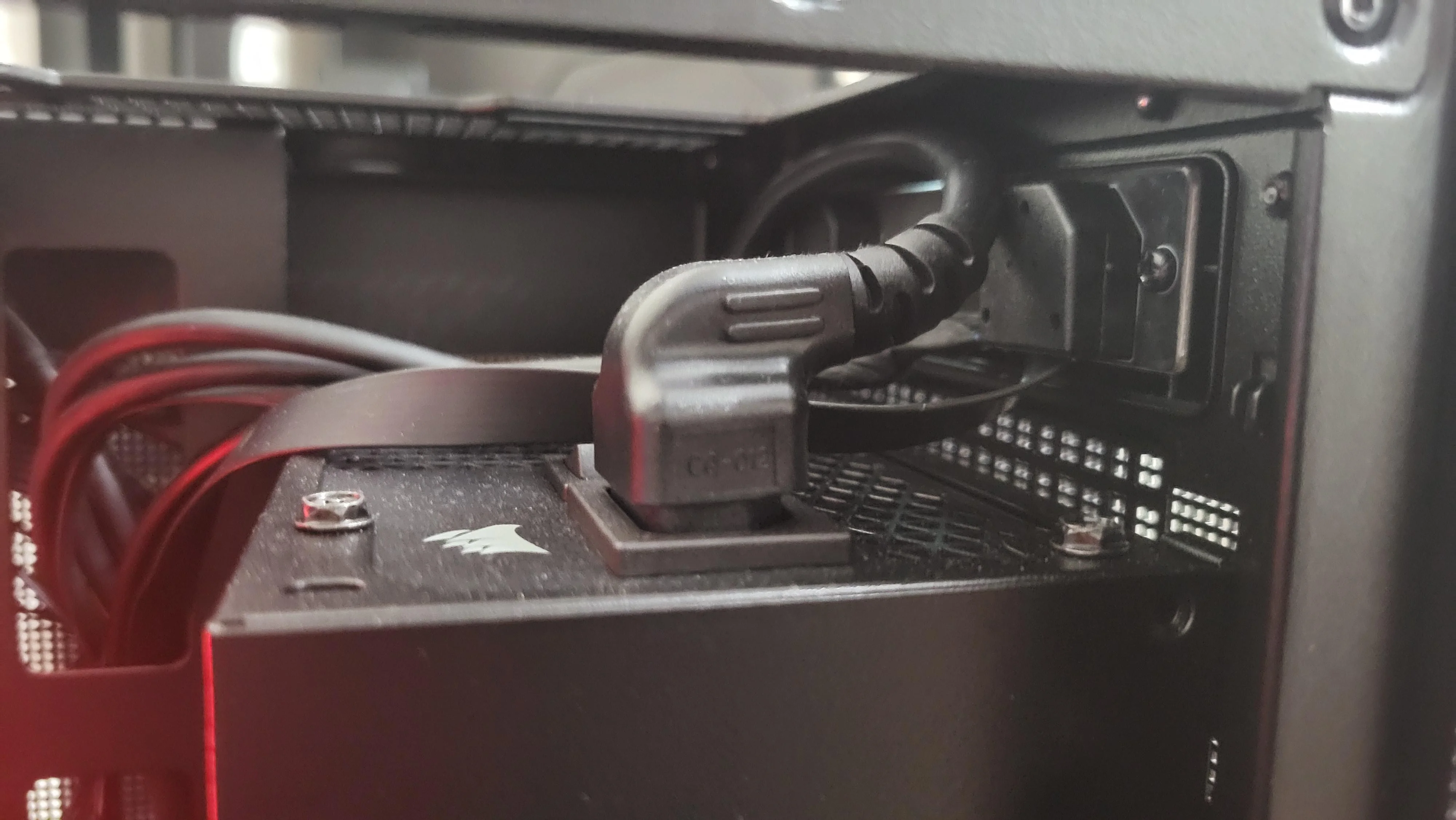 финальная оценка корпусу 8/10, где -1 балл за пидорские клипсы вместо базированных винтов и -1 балл за дизайненный ебланом штекер для бп, который с 99% блоков питания неудобно будет вставляться и шнур будет перегнутый, а на некоторые вообще не встанет, если разворачивать вентилятором на вдув воздуха снаружи. демонстративное фото с реддита с сутью проблемы. хз, чё им мешало вилку по-другому сделать.