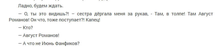 >>626832 А где тогда пусть не современный Пушкин, а хотя бы один нормальный стабильный автор в сетевой хуйне, творчество которого хотя бы прочитать можно? Вот я открываю так называемое "горячие новинки", царь целитель 6, первые строчки первой главы уже нанесли ущерб моему интеллекту >— Лихо ты его, — сказал мне Стас, подобравшись поближе. >— А ты ещё и сомневался? — усмехнулся Матвей. >Выражения его лица я не видел, так как продолжил движение вперёд, но по интонации уже понял, что мой приятель довольно улыбается.