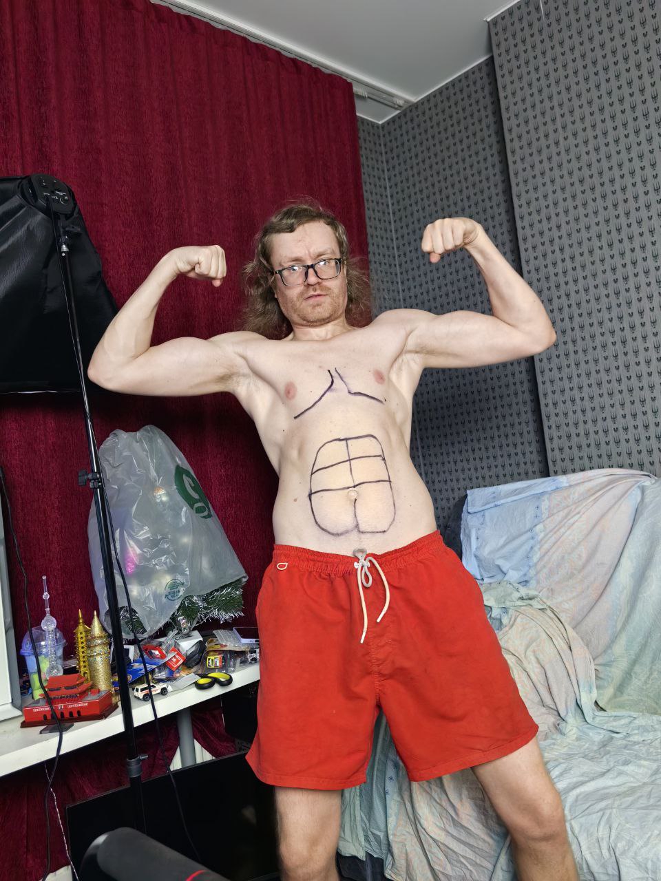 Недавно был видос где он приседать пробовал, при том что у него со спиной было не все в порядке, но вовремя остановился, слишком страшно стало. Когда искренне любишь всю вот эту фитнесс движуху и какие-то конкретные упражнения, то это нормально.