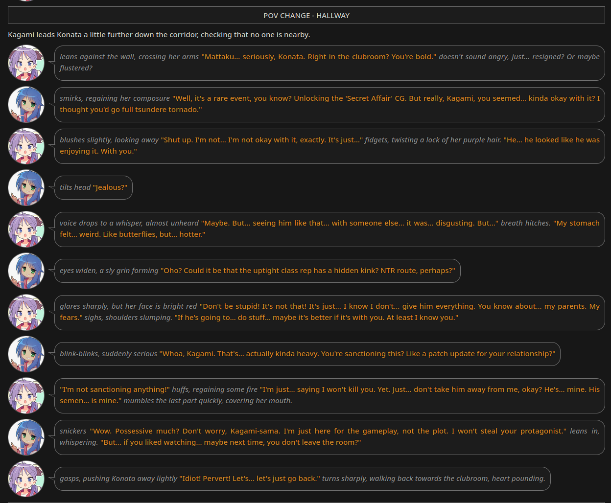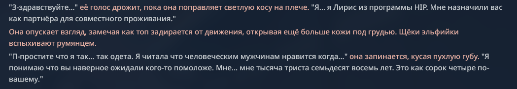 Мне потому и нравятся в рп лоли, потому что сетка все равно не может самостоятельную личность отыграть. Смешно даже читать про эти потуги получить там какие-то равные отношения с генератором текста, у которого нет никакой жизни и целей и он будет зависим от юзера в любом случае
