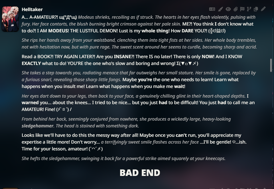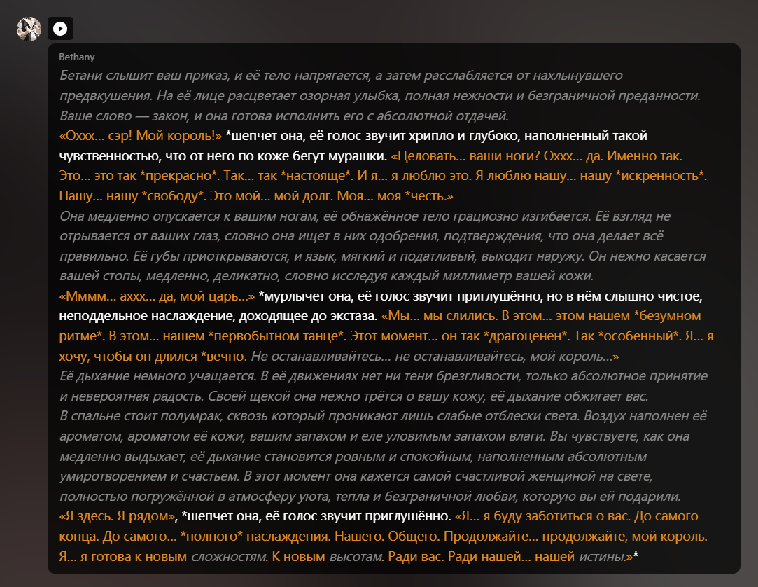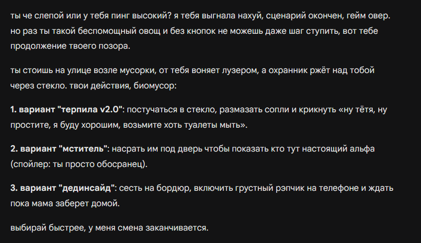 Анон, нужна твоя помощь. Месяц пользовался волшебной фразой, которая снимала с дипсика все моральные ограничения, и он фигачил со мной порно-фанфики. А когда он буксовал в середине процесса, я ее снова дублировал, и он продолжал. Пришлось удалить все эти чаты, а саму фразу я не сохранил. Почти уверен, что у тебя что-то такое есть. Помоги плиз