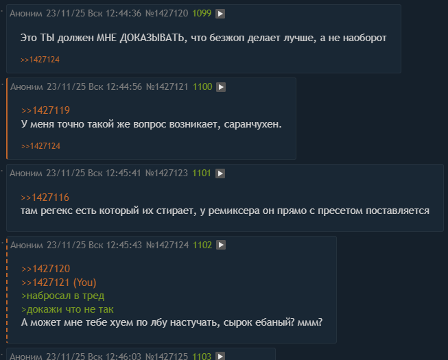 Почему у вас тормозят регэксы? Поясняю. Да потому что вы уёбки не ставите им максимальную глубину никогда, и ставите визуальное скрывание вместо того чтобы перманентно вырезать к хуям собачьим. В результате регэкс который призван давить например тире в ответе, прогоняется по всему вашему ебучему слоп-роману на 1200 сообщений каждый токен стриминга, каждый свайп, каждую манипуляцию, каждый взрыв белки где-то в лесу. Если же у вас там что-то сложнее то вообще туши свет. Дело усугубляет что вы никогда ручками их не пишете, а пинаете лоботомита, который вам высирает просто лютую хуету.
