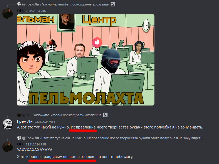 Потом Служанка создал свой дискорд-сервак и устроил герилью в ННН-треде, поджигал сраки пельманистам и рядовым анонам. "Я - говорил он - в нофаперской армии и в милиции служил. Я нофаперскому народу давал присягу. А это армия и полиция пельманская". Придумывал ахуительный тейк и с криком "вот вам, малолетние дебилы!" скидывал его в чат.